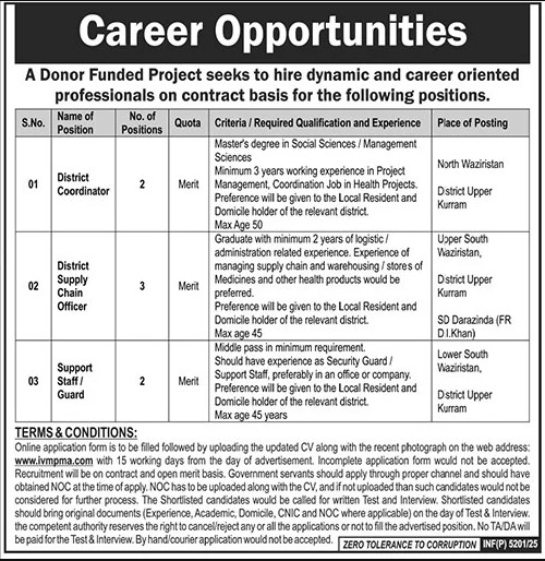 - Management, Coordination Job in Health Projects. Preference will be given to the Local Resident and Domicile holder of the relevant district. Max Age 50