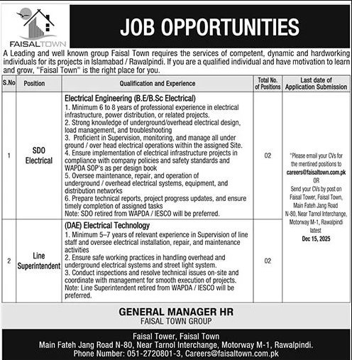 Candidates if you are seeking the A Leading and well-known job in Rawalpindi December 2025 if yes. It would be best if you tried to complete read A Leading And Well Knownjob because you can easily apply for these vacancies SDO Electrical Line Superintendent. Only male candidates can apply for A Leading and well-known job in Rawalpindi December 2025 Qualification /Experience Required:Electrical Engineering (B.E/B.Sc Electrical). Minimum 6 to 8 years of professional experience in electrical infrastructure, power distribution, or related projects. Strong knowledge of underground/overhead electrical design. load management, and troubleshooting, and more experienced candidates should apply before 15 December 2025.